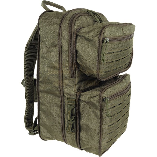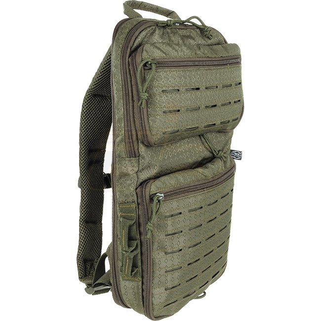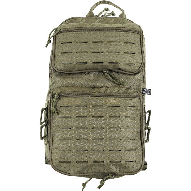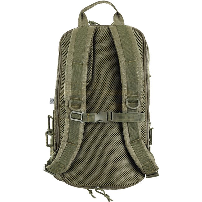 Compact and versatile backpack with adjustable straps, paddings, and multiple pockets for convenient storage. Features top carrying handle, chest strap, and Molle attachment loops for customization. Made of durable polyester material.