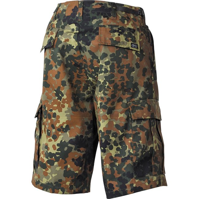 MFH BW Bermuda Shorts Side Pockets - Flecktarn - S. Front zip, 6 pockets, adjustable waistband. 65% Polyester, 35% Cotton.