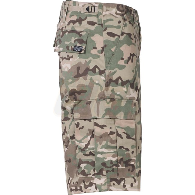 Comfortable MFH BW Bermuda shorts in Operation Camo design, size M. Features front zipper, 2 pants pockets, 2 hip pockets with flap and buttons, 2 leg pockets, adjustable waistband, and extra wide belt loops. Made of 65% polyester and 35% cotton material.