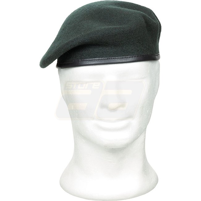 Commando beret in dark green color, size 61. Classic French and German style with small and flat design. Made with 100% wool outer material and lined with 100% cotton. Features a leather hem edge with drawstring, 2 ventilation eyelets on the right side. E