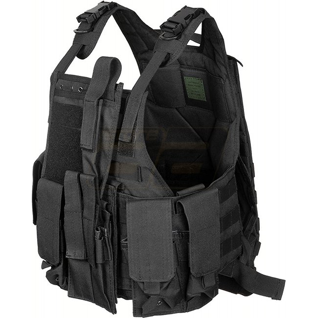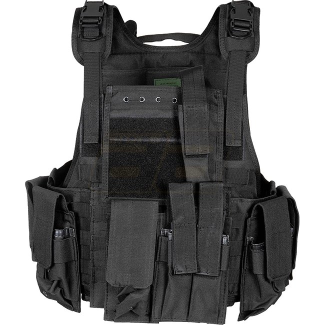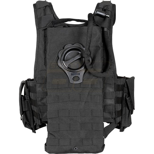 MFH Ranger Vest - Black: Tactical vest with integrated hydration system, multiple pouches, and Molle loop system. Adjustable fit, detachable parts, and made of 100% Polyester fabric.