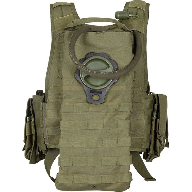 Tactical vest with integrated hydration system, detachable pouches, and adjustable features. Ideal for carrying ammo and equipment during outdoor activities.