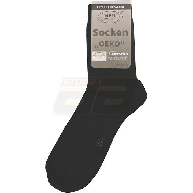 MFH Socks Oeko in Black, size 39-41, made of bamboo fiber. Soft, breathable, and promoting blood circulation. OEKO-TEX STANDARD 100 certified. 75% Viscose, 22% Polyamide, 3% Elastane.