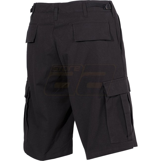 Stylish MFH US Bermuda Shorts Ripstop in Black, size L. Made of 100% Cotton with button fly, 2 pants pockets, 2 hip pockets, and 2 leg pockets with flap and buttons. Features adjustable waistband and extra wide belt loops.