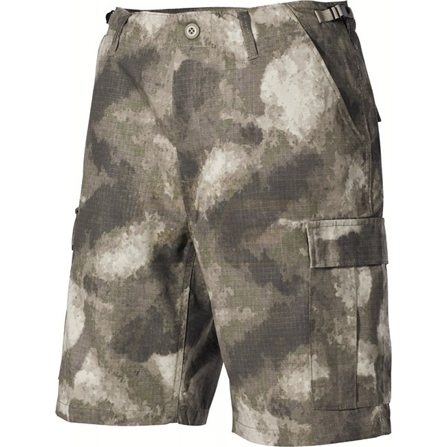 MFH US Bermuda Shorts Ripstop - HDT Camo - XL. Stylish and durable camo shorts featuring button fly, multiple pockets, adjustable waistband, and extra wide belt loops. Made of 100% cotton.