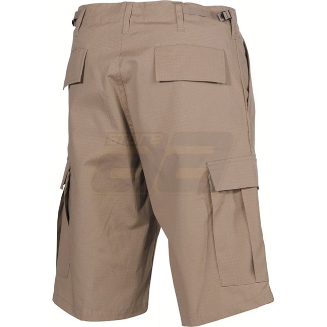 High-quality MFH US Bermuda Shorts made of durable Ripstop fabric in Khaki color. Features button fly, 2 pants pockets, 2 hip pockets with flap and buttons, 2 leg pockets with flap and buttons, adjustable waistband, and extra wide belt loops. Made of 100%