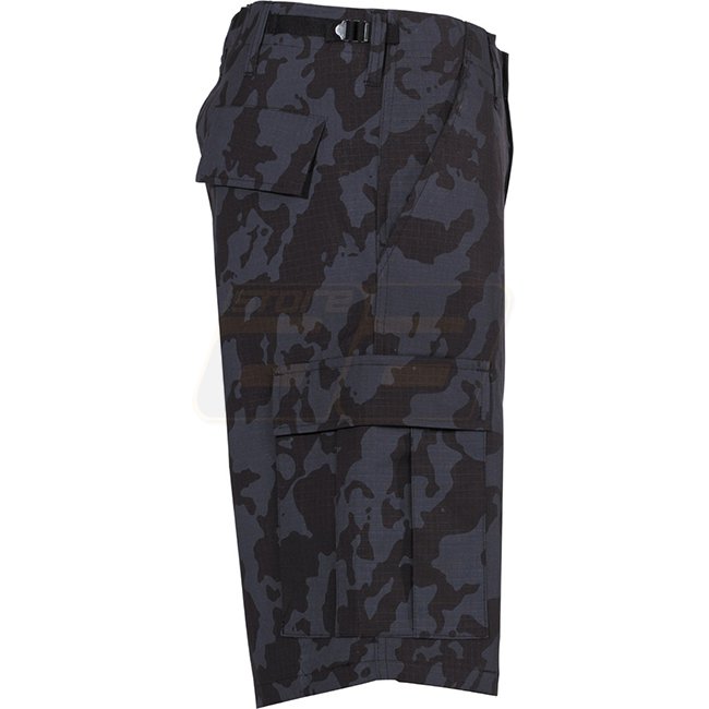 MFH US Bermuda Shorts Ripstop in Night Camo - XL. Button fly, 6 pockets with flap and buttons, adjustable waistband, extra wide belt loops. Made of 100% Cotton.