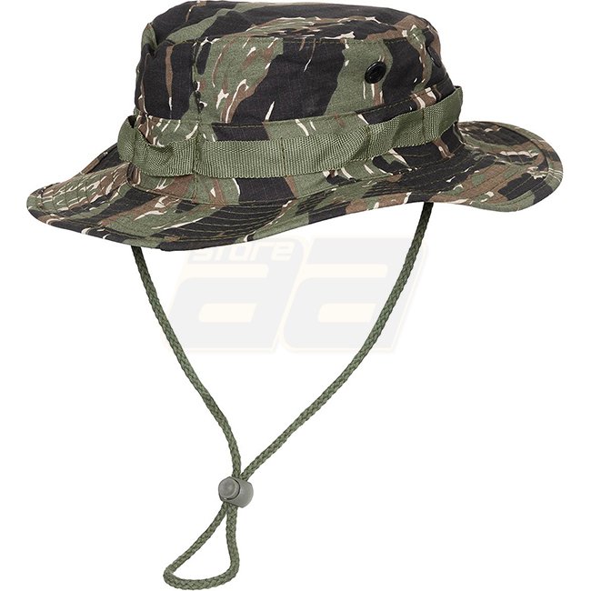 MFH US Boonie Hat Ripstop in Tiger Stripe. Durable and stylish hat with multi-quilted brim, circumferential loops, 4 ventilation eyelets with mesh, and chin strap with cord stopper. Made of 100 % Cotton.