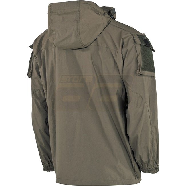 MFH US Soft Shell Jacket GEN III Level 5 - Olive - M: Waterproof, windproof, breathable jacket with concealed zip, chest and sleeve pockets, hood with drawstring, velcro panels, 2-way pit-zip vents, adjustable sleeve ends, and elbow darts for comfort. Mat