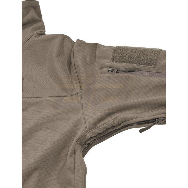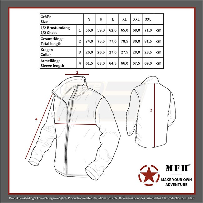 MFHHighDefence HIGH DEFENCE Soft Shell Jacket in Olive - S. Waterproof, windproof, breathable, concealed 2-way-zip, multiple pockets, velcro panels, adjustable features, reinforced elbows and waterproof zips. Material: 94% Polyester, 6% Elastane. Lining: