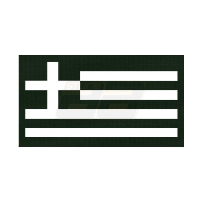 Pitchfork Greece IR Print Patch - Ranger Green. Front: IR foil, printed. Back: Hook surface. Dimensions: 90 x 50 mm.