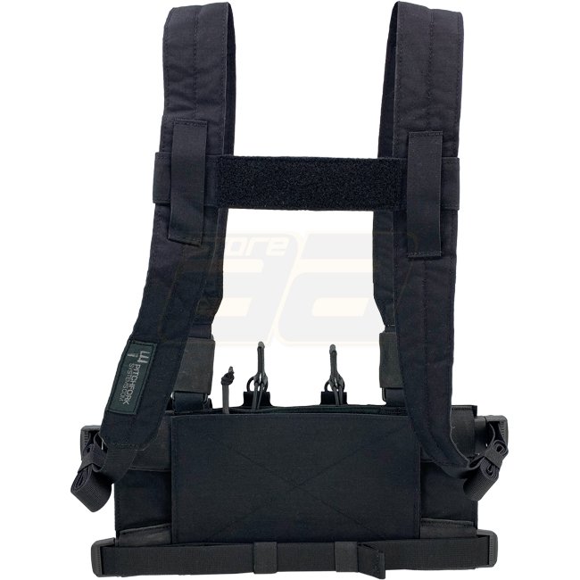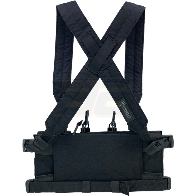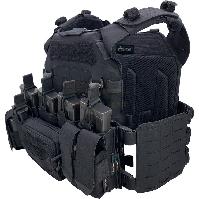 The Pitchfork MCR Modular Chest Rig - Black is a versatile MOLLE-based chest rig set complete with a variety of pouches and adjustable shoulder and hip straps. Perfect for organizing and carrying your gear.