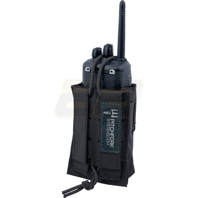 Pitchfork Universal Padded Radio Pouch - Black: Designed for small to medium radios, this pouch offers height-adjustable inner floor, adjustable elastic straps, and full padding. Suitable for MOLLE systems and belts. Material: Cordura 500D Nylon & LaserCu