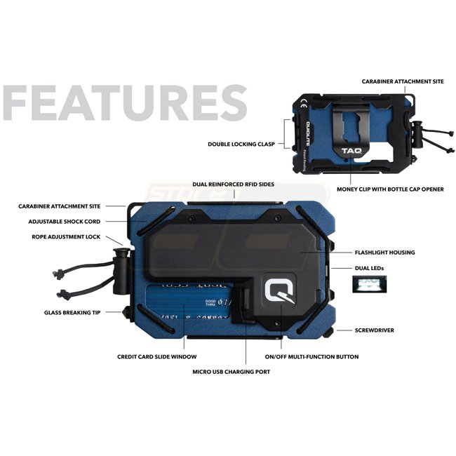 TAQWallet ist DIE WELTWEIT EINZIGE taktische Geldbörse mit einer leistungsstarken, über USB wiederaufladbaren LED-Taschenlampe mit Sicherheitsblitz, integriertem Flaschenöffner, Schraubendreher, Glasbruchspitze und Karabiner-Befestigungsstelle.