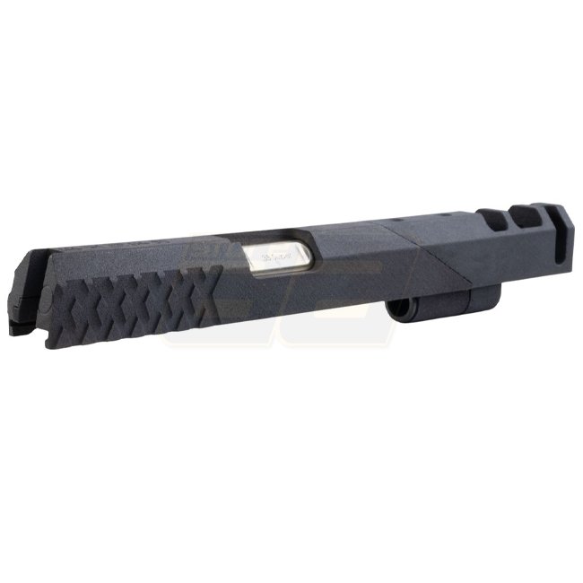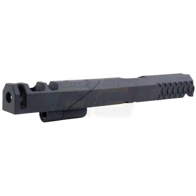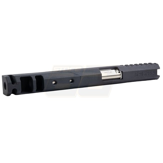 This deluxe kit features a durable 3D-printed slide engineered for fast cycling and crisp blowback. It includes a pre-installed BBU housing, aluminum outer barrel engraved “.38 Super”, printed compensator, guide rod plug and recoil spring — all drop-in for Marui Hi‑Capa GBB pistols.