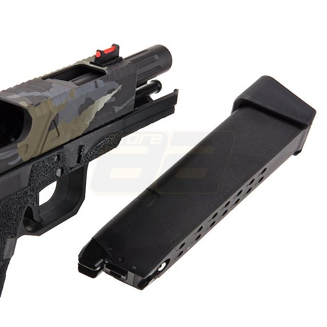 RWA Agency Arms EXA Gas Blow Back Pistol in Cerakote Multicam Black - lightweight and durable design, with adjustable hop-up and semi-auto shooting mode. Includes a 23-round magazine and has a shooting range of 41.16-43.90m.