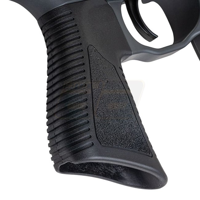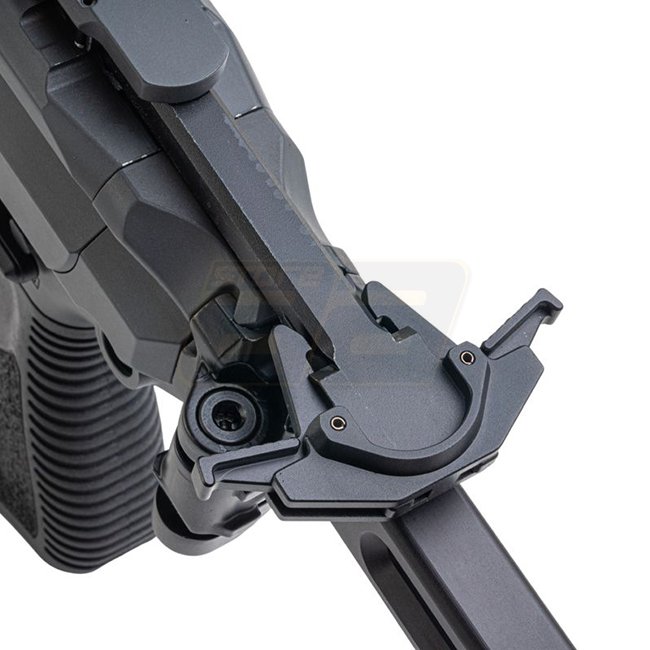 Feuerschalter, Ladehebel und Magazinauslösung sind beidseitig ausgelegt. Das Gehäuse verfügt über einen verbreiterten Magwell und integrierte QD-Sling-Punkte. Der klappbare Schaft mit gummierter Schaftrückseite verbessert Handhabung, Dämpfung und Transport.