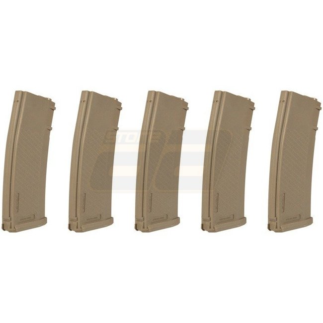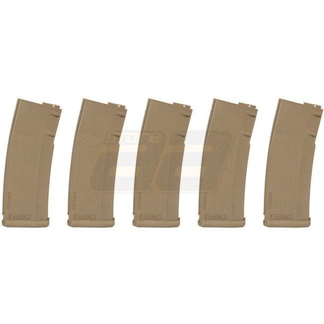 Get the Specna Arms 125rds S-Mag Magazine Set in Tan featuring 5 polymer magazines suitable for M4/M16 AEGs. Each magazine has a capacity of 100 rounds, weighing 155g.