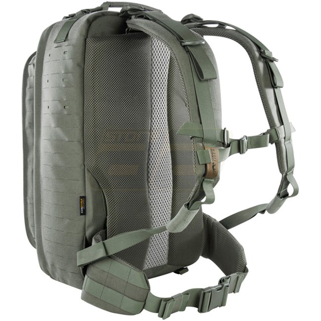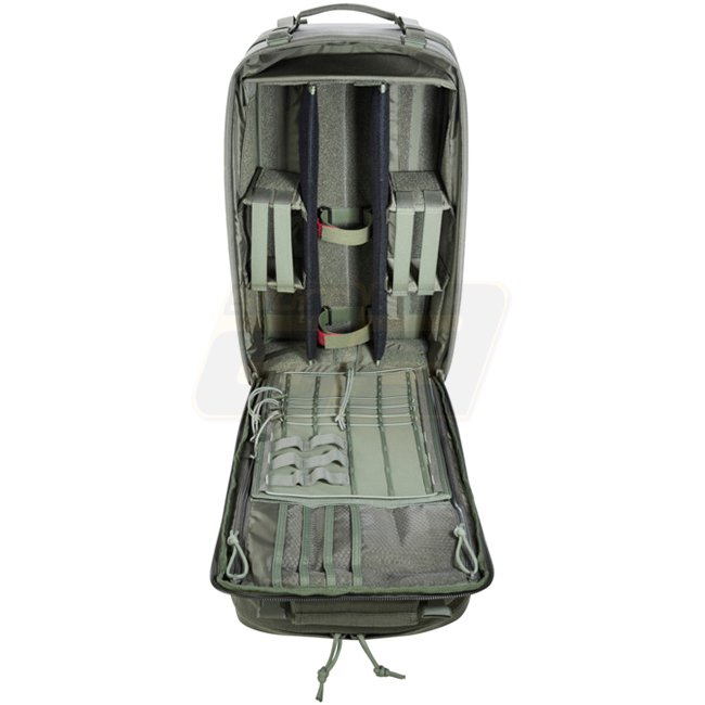 Das System bietet zwei in einem: der Frontrucksack kann abgenommen und separat getragen werden, wodurch maximale Flexibilität entsteht. Innen sorgen verstellbare Klett-Partitionen für individuelle Organisation, beispielsweise zur Aufnahme einer 2 l Sauerstoffflasche Ø 100 mm, Länge 430 mm. Laser-cut MOLLE System an Front und Seiten ermöglicht modulare Erweiterung.