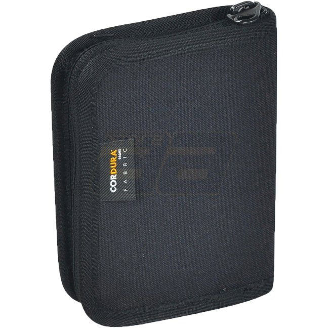 Tasmanian Tiger Mil Wallet in Black. Secured with locking zip, this wallet includes card and coin compartments, a transparent pocket for military and ID cards. Made of Cordura 700D, measures 14x10x3cm and weighs 110g.