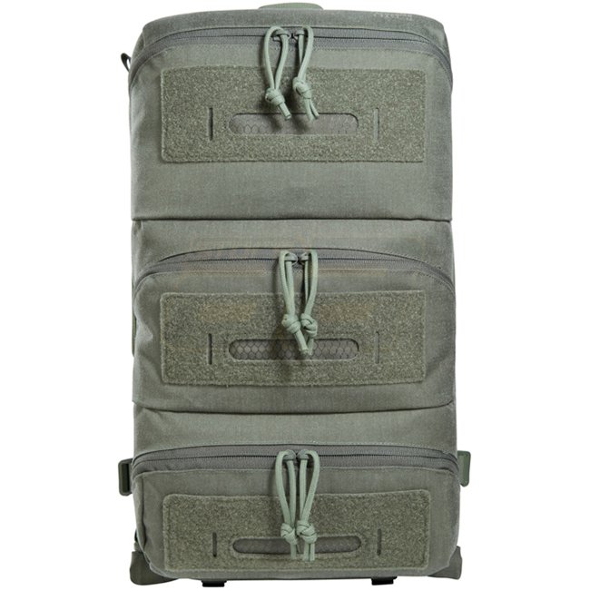 - MOLLE-Flächen intern für modulare Erweiterung; drei Fronttaschen mit verschiedenen Innenaufteilungen und Klettflächen zur Beschriftung