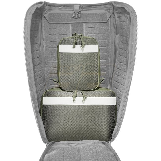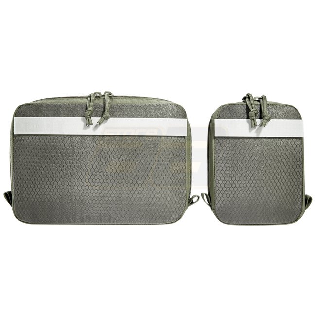 Robust Tasmanian Tiger Multipurpose Pouch Set in Olive for hook-and-loop attachment. Includes two bags with transparent mesh lids and hook-and-loop strips. Versatile, lightweight, and easy-to-use for modular backpacks.