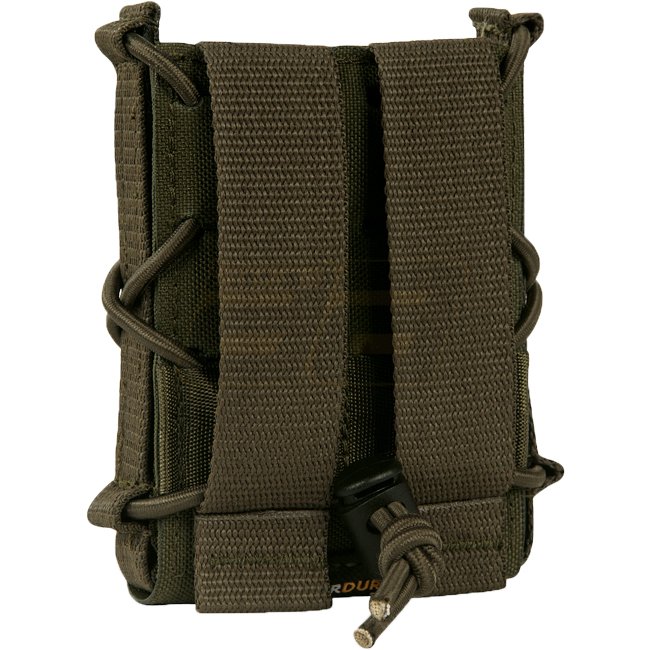 Short open multi-calibre magazine pouch for M4 / G36 PMAG / Sig / etc. Bungee cord on the side with cord stopper. Single magazine capacity. For M4 / G36 PMAG / Sig / AR15 / Steyer AUG , Sig 55X etc. MOLLE reverse system. Laser cut MOLLE on front.