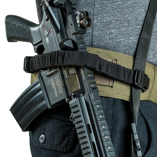 Removable strap, can be fastened to the side of the equipment with two MOLLE buckles. Makes it possible to affix an MP or long weapon in the resting position.