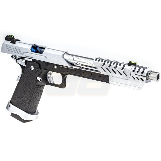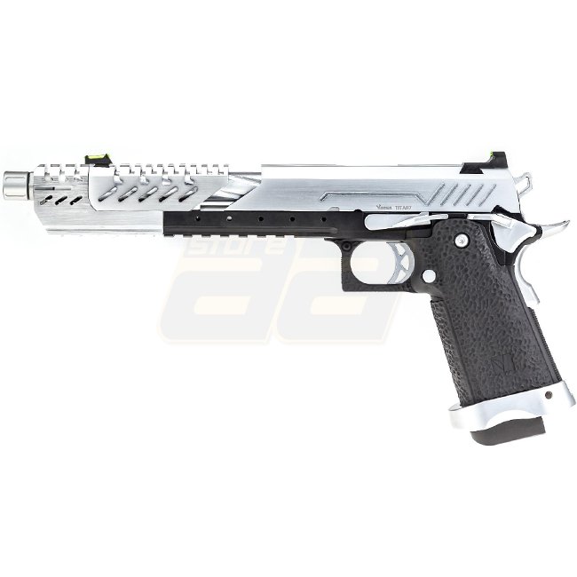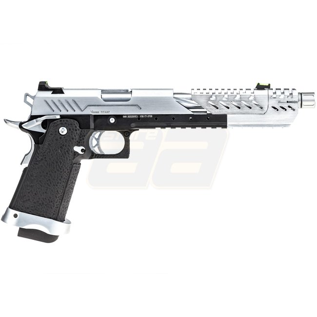 Vorsk Hi-Capa Titan 7 Gas Blow Back Pistol - Chrome is a high-quality airsoft gun made of metal and polymer, featuring a 24 round magazine, 240mm length, 1000g weight, 167mm inner barrel length, and a shooting mode of Semi Auto, with adjustable hop-up. Pa