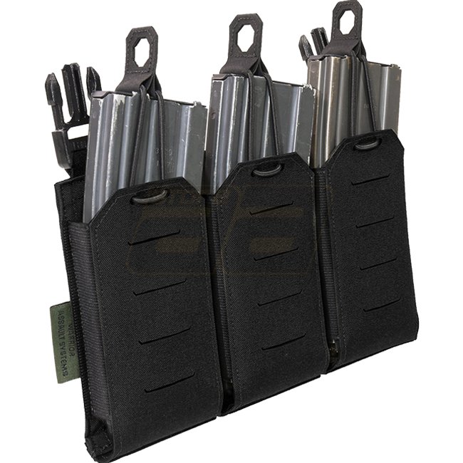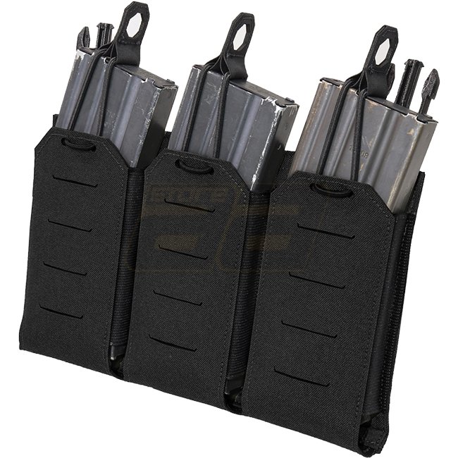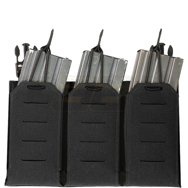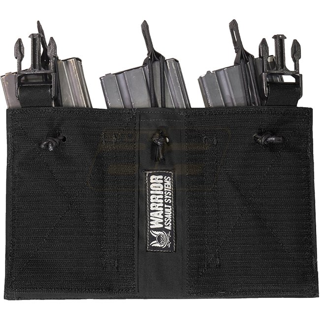 The Warrior Laser Cut Triple Bungee 5.56 Magazine Pouch is a detachable front panel designed to hold three 5.56 mm magazines. It attaches securely to the front of Warrior's Laser Cut LPC Plate Carrier. Elastic bungee cords and a Hypalon lining provide magazine retention even without additional securing measures.