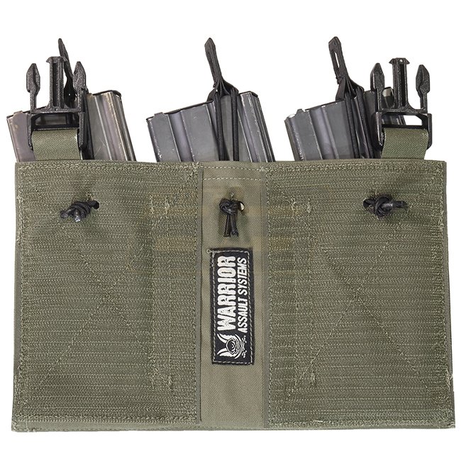 The Warrior Laser Cut Triple Bungee 5.56 Magazine Pouch in Ranger Green is a detachable front panel designed to securely hold three 5.56 mm magazines. Elastic bungee cords and a Hypalon lining assure magazine retention without additional measures.