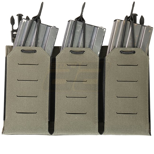 The Warrior Laser Cut Triple Bungee 5.56 Magazine Pouch is a detachable front panel designed to hold three 5.56 mm magazines. It attaches securely to the front of Warrior's Laser Cut LPC Plate Carrier. Elastic bungee cords and a Hypalon lining provide magazine retention even without additional securing measures.