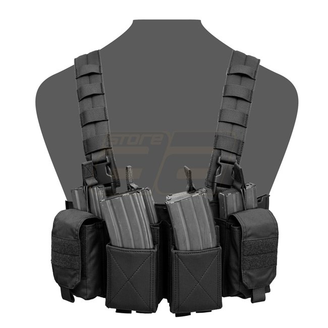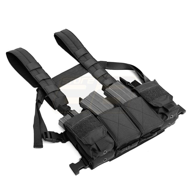The Warrior Pathfinder Chest Rig in Black is a versatile tactical gear that can carry 4x M4 or 4x AK magazines and more. It features elastic loops for storing chemlights and torches, along with utility pouches for additional gear.