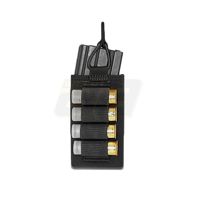 The Warrior Single Open 5.56mm mag pouch features elastic retention for fast and smooth magazine changes. It has a low-profile design and includes space for four 12-gauge Hatton breaching shotgun shells or CS marker rounds. The main compartment is lined with black non-slip Posigrip material to provide extra magazine retention.