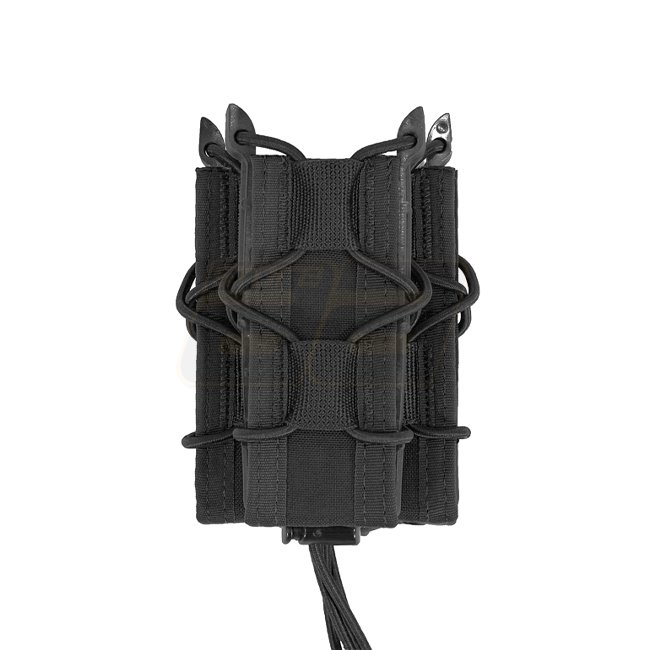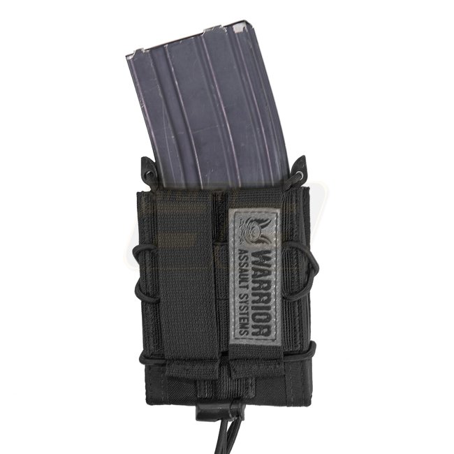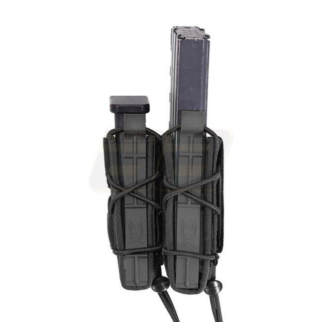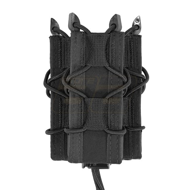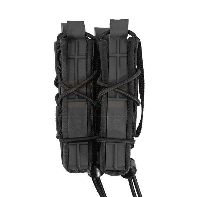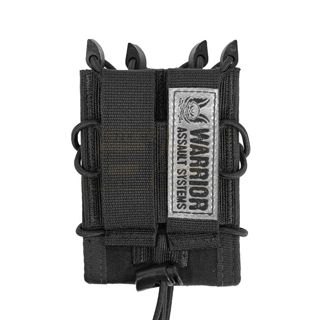 The Warrior Single Quick Mag Pouch is a versatile multi-purpose pouch designed to hold various 5.56mm magazines, including P-Mags, as well as 7.62mm x 39mm AK mags, M14, and FAL mags. This version features a fully adjustable pistol pouch mounted on the front, capable of holding a variety of pistol magazines, flashlights, multi-tools, and batons. Both pouches offer size adjustment using elastic shock cords threaded through the sides. Optional bungee retention tabs are available for those requiring additional magazine security.