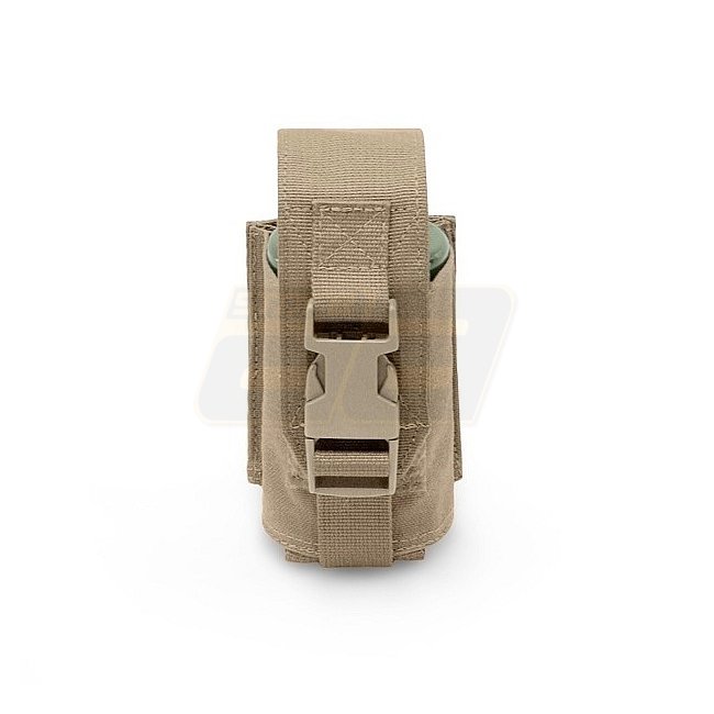 Compact coyote brown pouch for single smoke grenade. MOLLE compatible, fits grenades up to 38mm diameter. Durable and functional.