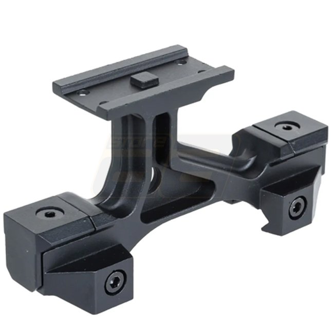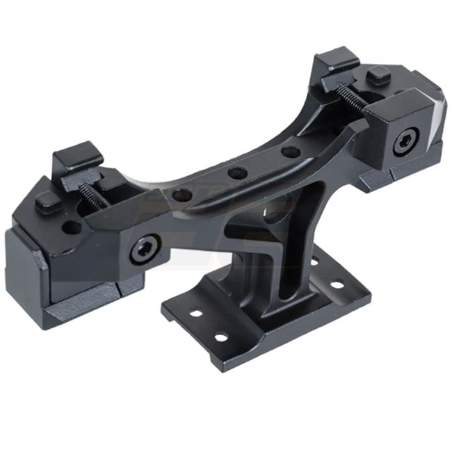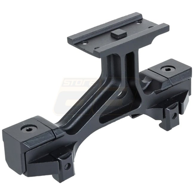 The Wosport EX‑059 mount is made of aluminum and provides a stable platform for T2 red dot sights and compatible optics. Designed for RIS/Picatinny rails, it allows precise alignment via 10 mm and 35 mm hole spacing. Three additional mounting rails expand configuration options for accessories. Despite its robust build, the mount remains relatively light at 185 g.