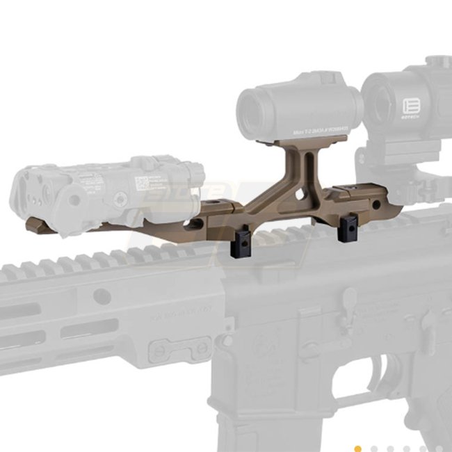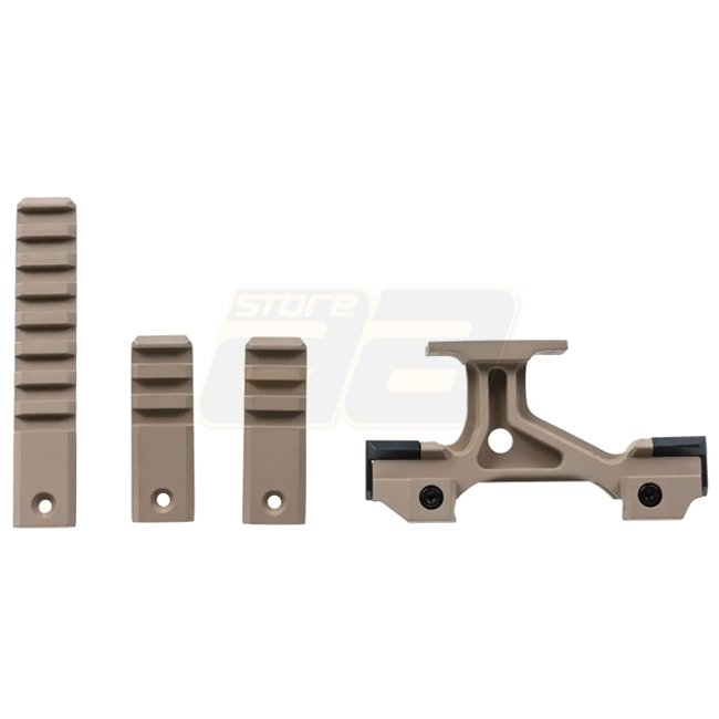 The Wosport EX‑059 mount is made of aluminum and provides a stable platform for T2 red dot sights and compatible optics. Designed for RIS/Picatinny rails, it allows precise alignment via 10 mm and 35 mm hole spacing. Three additional mounting rails expand configuration options for accessories. Despite its robust build, the mount remains relatively light at 185 g.