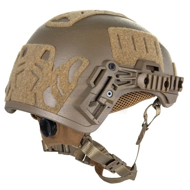 The Wosport EX HL‑103 replica helmet features a durable ABS shell with a matte, textured finish to minimise glare. An adjustable fit knob ensures a secure fit, with multiple foam cushions for comfort during extended wear. It includes side rails for mounting accessories, a front mount for NVG devices, and large Velcro areas for patches or markers.