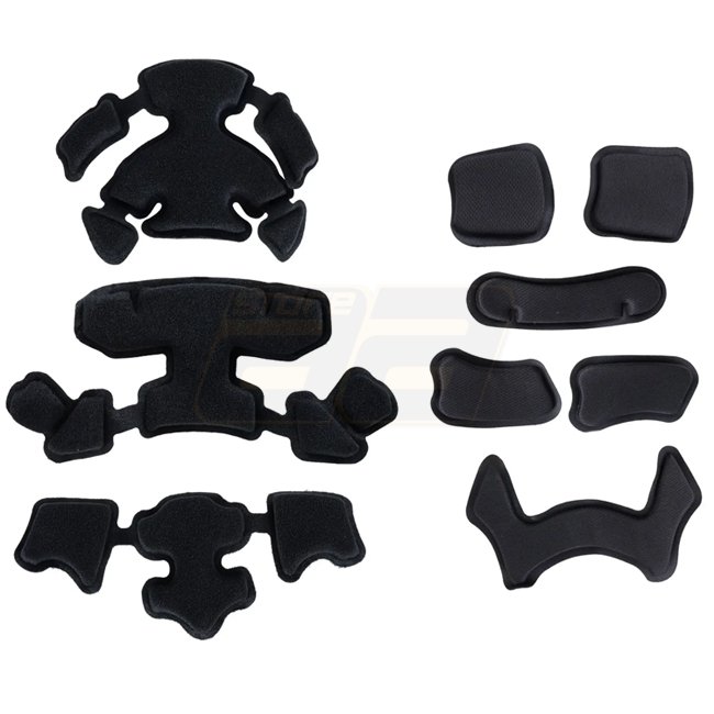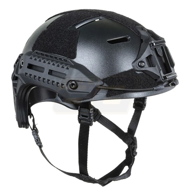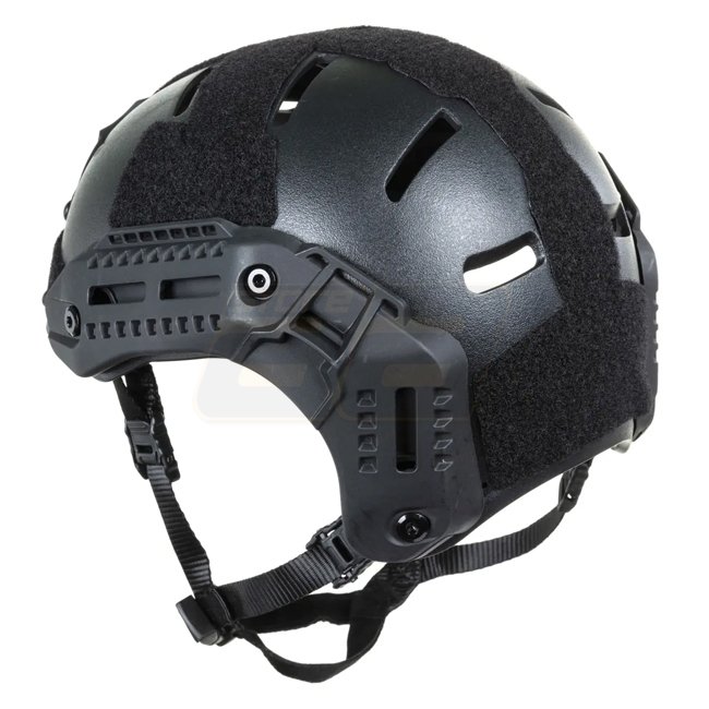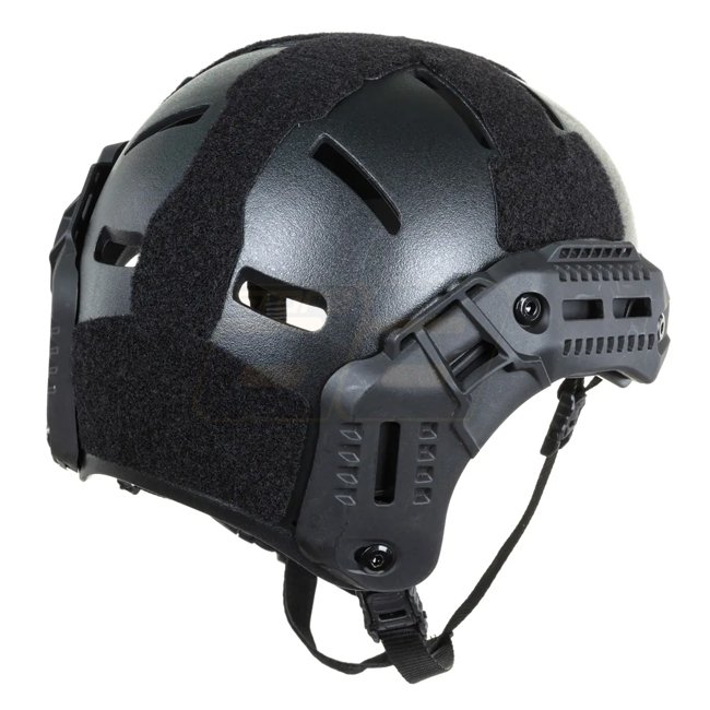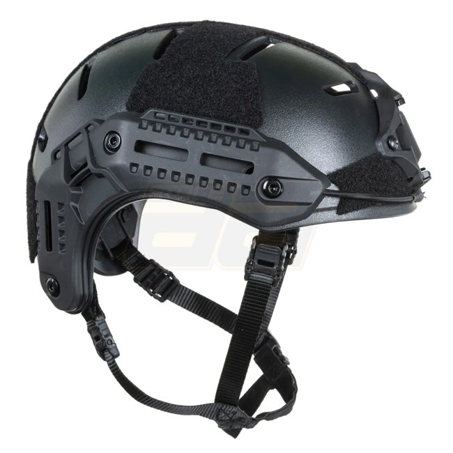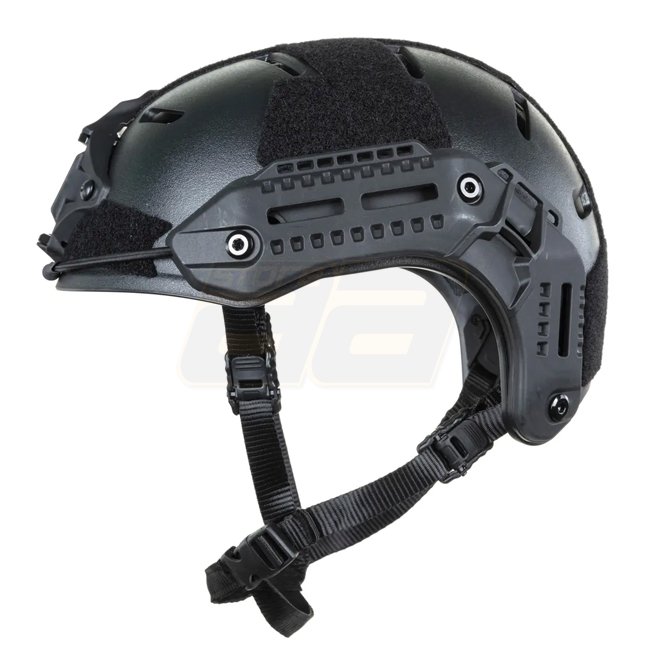 The Wosport MK HL‑104 training‑version replica helmet features an ABS‑nylon shell with a rough matte finish to minimize glare and ventilation ports. It includes nine Velcro‑attached cushions inside for a secure and comfortable fit. Accessory rails on the sides and NVG mount in front are included, along with large Velcro areas for patches or markers. The 4‑point chin strap comes with a padding at the chin; extraction cables are also supplied.