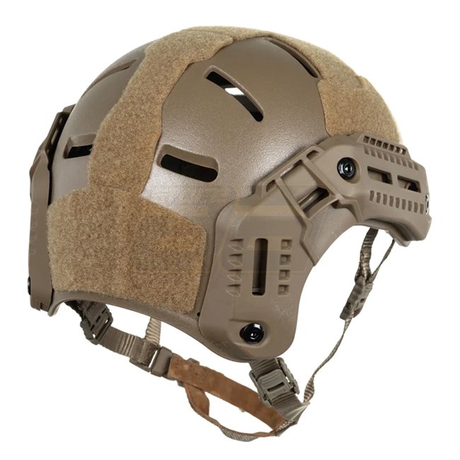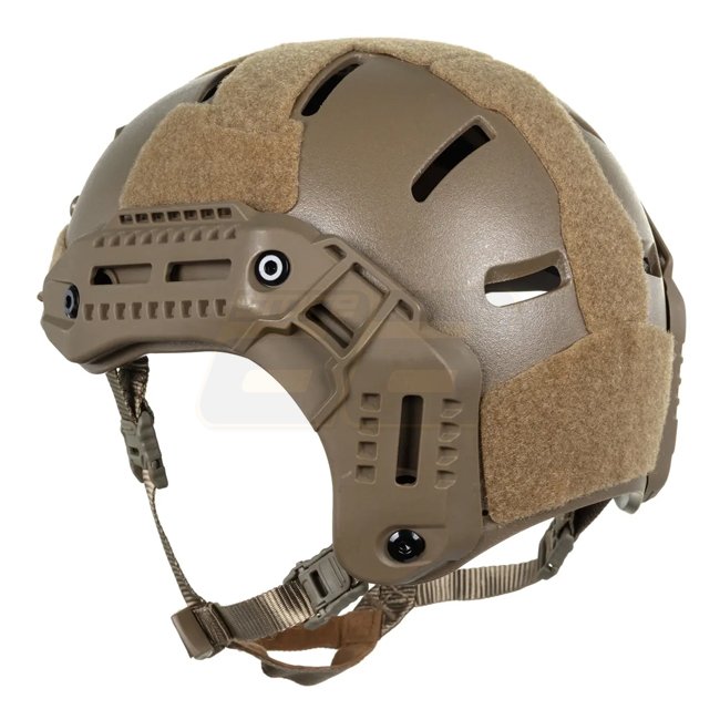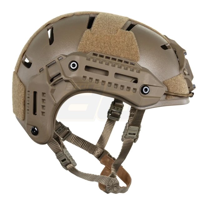 The Wosport MK HL‑104 training‑version replica helmet features an ABS‑nylon shell with a rough matte finish to minimize glare and ventilation ports. It includes nine Velcro‑attached cushions inside for a secure and comfortable fit. Accessory rails on the sides and NVG mount in front are included, along with large Velcro areas for patches or markers. The 4‑point chin strap comes with a padding at the chin; extraction cables are also supplied.